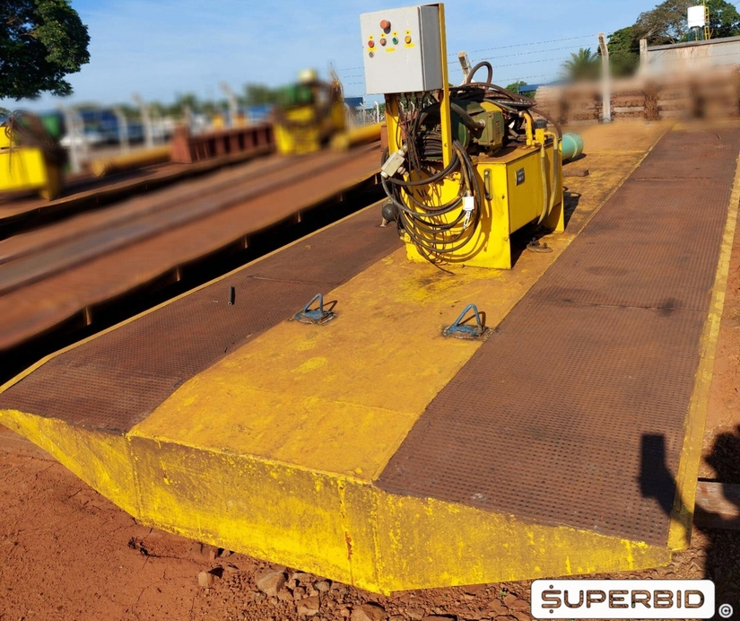 Capacidade para 35ton., equipada com 01 cilindro hidráulico, e 01 unidade hidráulica para acionamento da plataforma, com motor weg mod. 160m 20cv 1765rpm 220/380v, aproximadamente 9,65mtx 2,60mt, plaqueta 72163